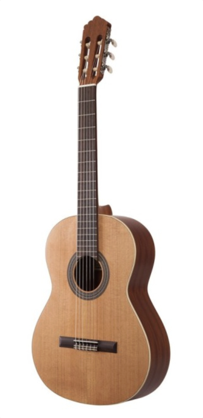 Guitare classique 4/4, Table Cèdre massif, manche, dos et eclisses en Acajou Africain, touche en Palissandre indien, diapason 650mm, finition Vernis brillant, sillet 52mm, barrage en “A”