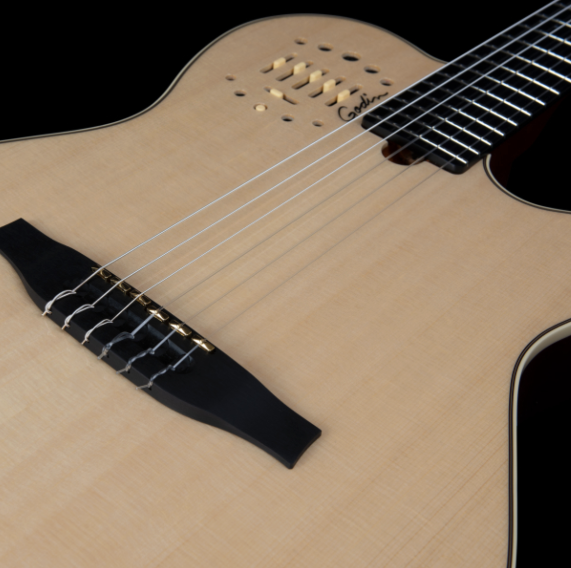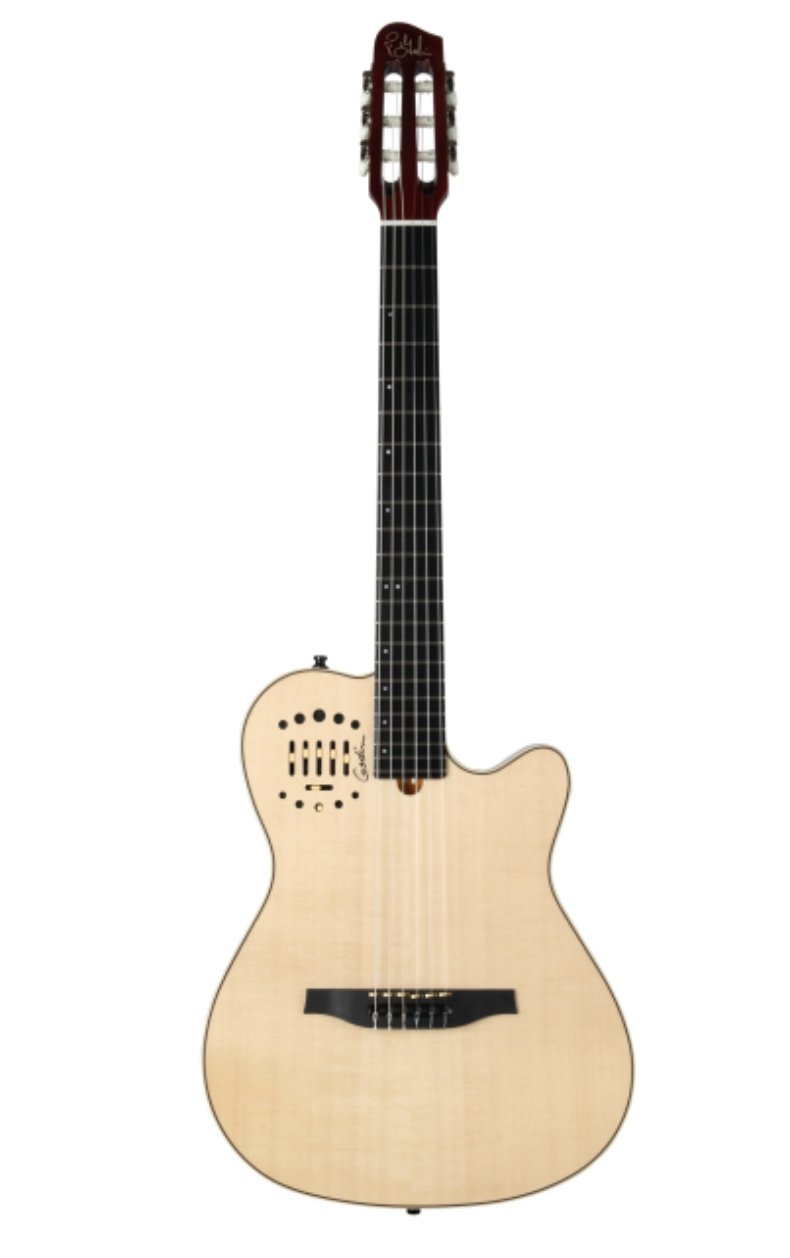 La Multiac Nylon Deluxe offre un degré de raffinement et de performance incomparables dans le domaine des guitares modernes à cordes de nylon. Cette guitare représente un design Godin véritablement visionnaire, ainsi que l’aboutissement d’une étroite collaboration avec LR Baggs pour développer un système électronique sur mesure et de pointe.