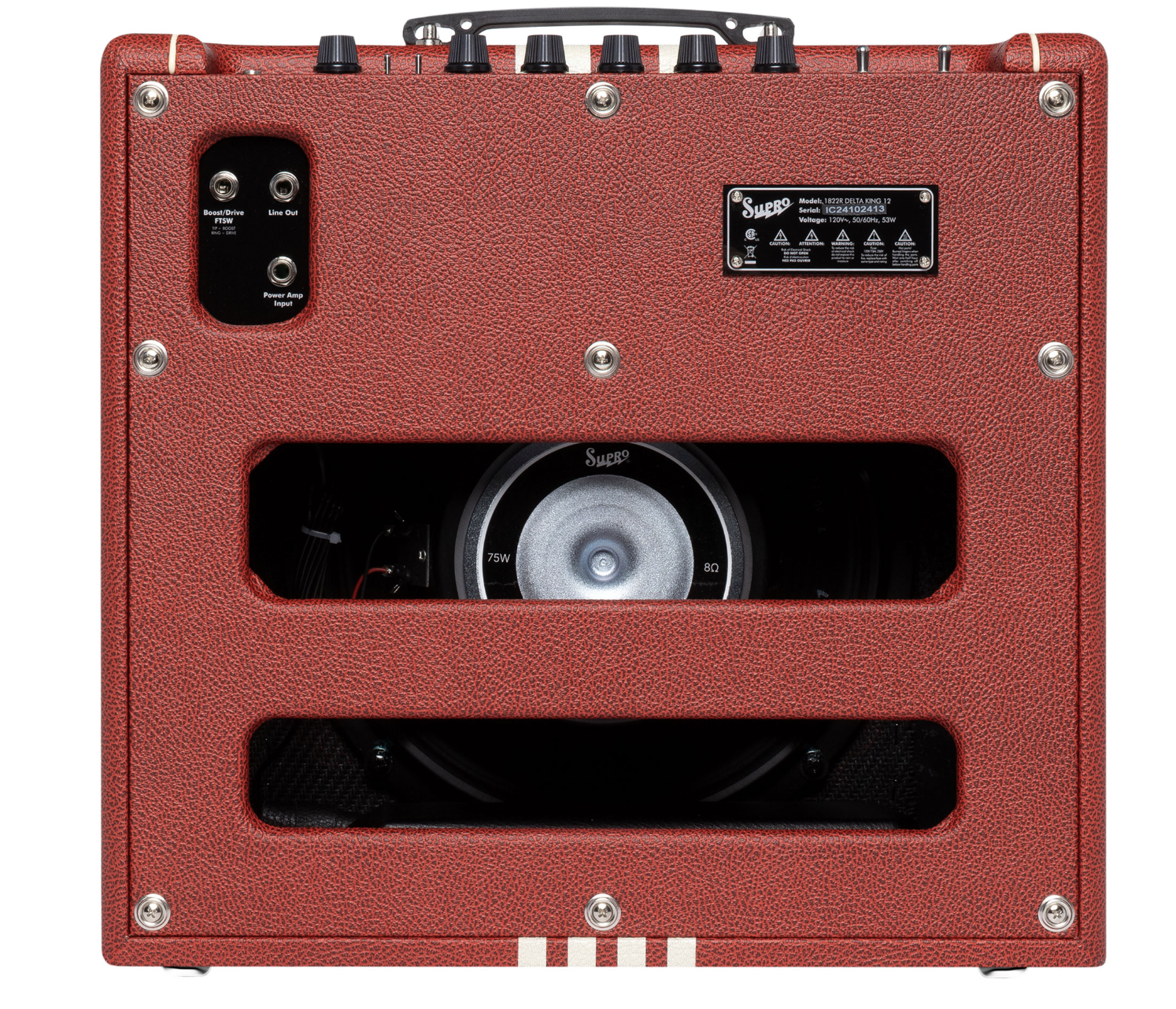 Son amplificateur de puissance à lampes de classe A à alimentation unique offre les mêmes caractéristiques sonores brutes et les mêmes caractéristiques de sensibilité au toucher que ses homologues du milieu du siècle, tout en délivrant 15 watts de puissance à lampes 6L6 à travers notre haut-parleur DK12 de 12 pouces personnalisé.